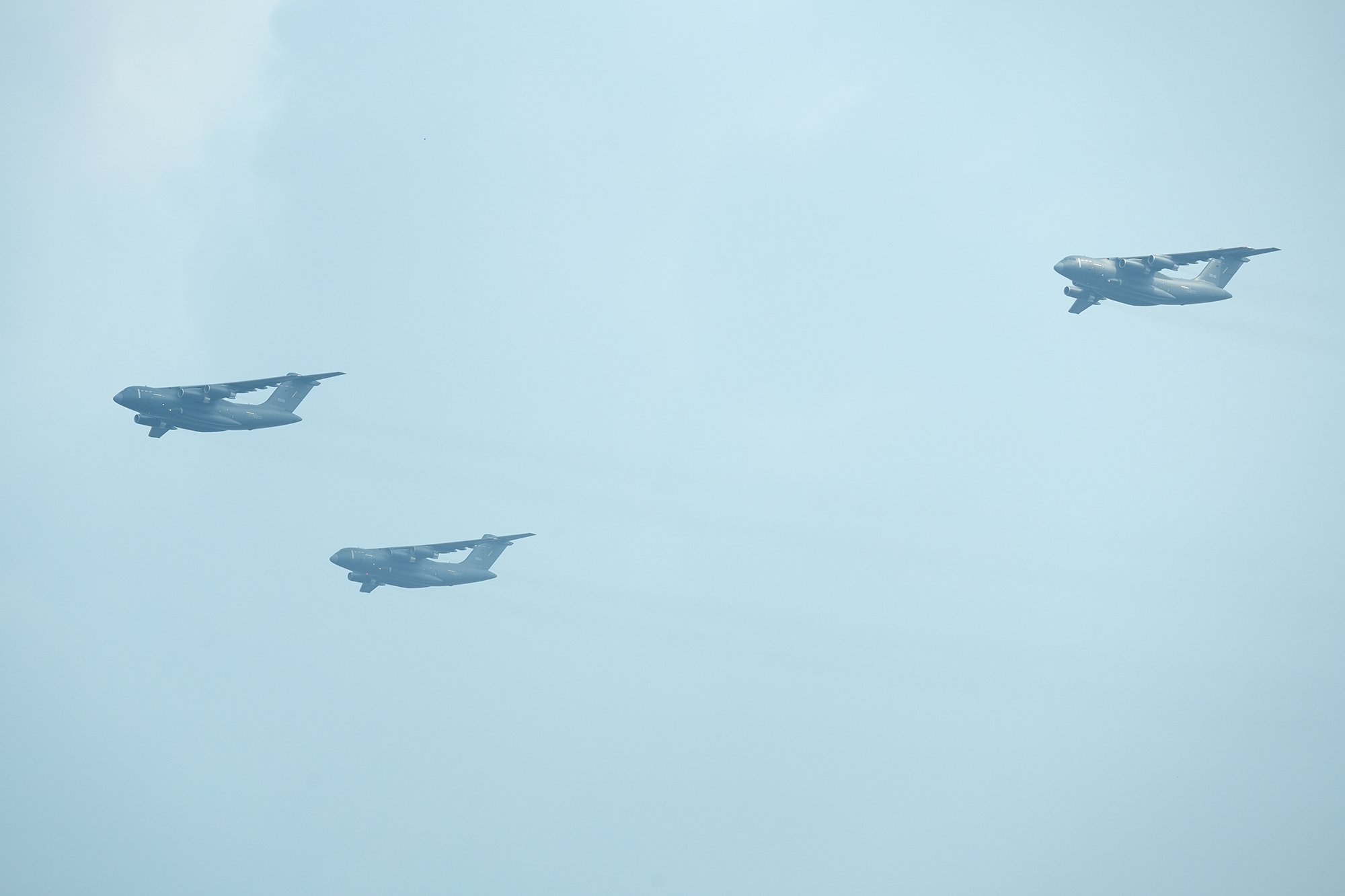 运20A、运20B编成两个楔队,以战斗姿态编组飞行。新型多用途运输机配装新型国产发动机,航程远、载重大、速度快,具备远程战略投送能力。摄影:郑宇航