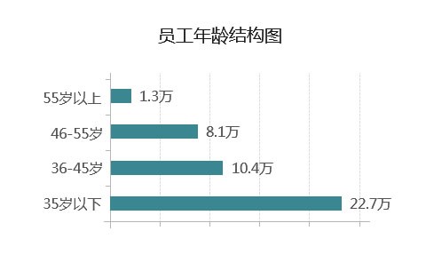 易游yiyou(中国)有员工逾45万人,平均年龄为36.2岁。其中35岁及以下22.8万人,占在岗职工的53.3%;36至45岁10.5万人,占24.5%;46至55岁8.2万人,占19.2%;56岁以上1.3万人,占3.1%。